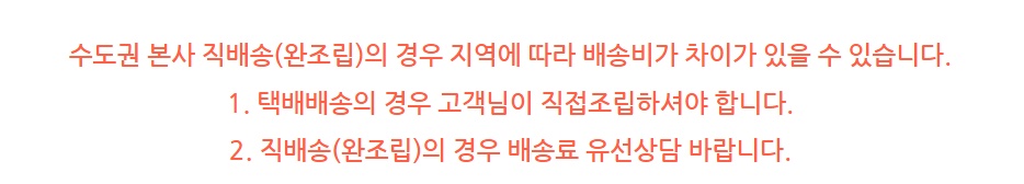 - 미조립 선택 시 박스 개봉후 파손, 변형, 제품 하자는 당사에 책임이 없음을 알려드립니다. (가까운 지역의 대리점이나 본사 통화후 주문하시기 바랍니다.)